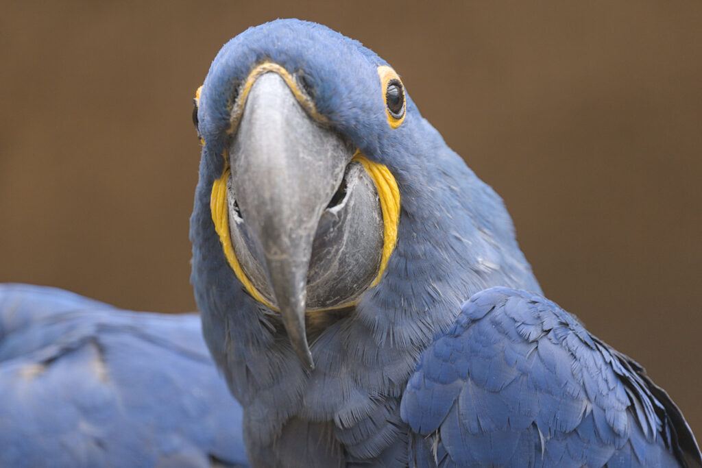 ブラジル中央部を中心に一部ボリビアにもまたがる南米中央地域に生息する、飛行可能なオウムとしては世界最大の種。他のコンゴウインコ類と異なり、目の周り以外は顔も鮮やかなコバルトブルーの羽毛に覆われており、またその巨大かつ鋭くカーブしたクチバシは生息地に点在する椰子の木になった実などの硬い殻を割るのに適応しています。