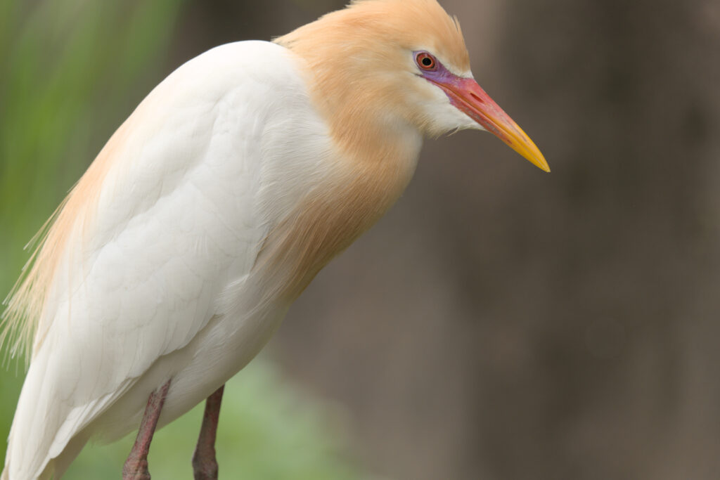 インドから東南アジア・オーストラリアまで幅広い地域に分布し、日本にも夏鳥として渡来するほか、九州以南の地域では冬場もそのまま越冬することがあります。本種は春から夏にかけての繁殖期には首から上と背中の一部に濃いオレンジ色の羽毛をまとい、クチバシも赤みを帯びた濃い色となりますが、その後繁殖期が終わると薄い色になり、またクチバシの色も薄まります。また、元来は草原で牛の群れについて行動し、その蹄の動きに驚いた昆虫が飛び跳ねて退避するところを捕食するという採餌方法を習性としていることから、現在でも放牧地でその姿が見られるほか、田畑においてはトラクターに集団でついてくるという動きを見せることもあります。