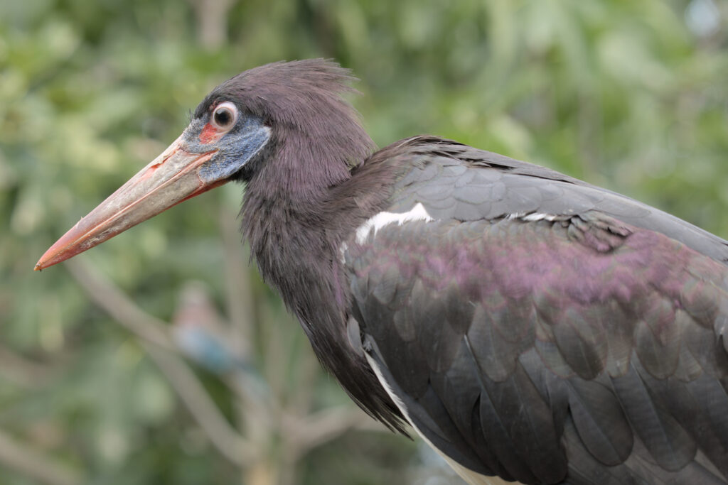 アフリカ南部の草原、サバンナ、森林地帯にわたって幅広く分布するコウノトリ科最小の種。クチバシ周りの皮膚が青いのが特徴で、昆虫を主食としています。また、生息地のアフリカでは雨と幸運をもたらす鳥という言い伝えがあり愛されている鳥でもあります。