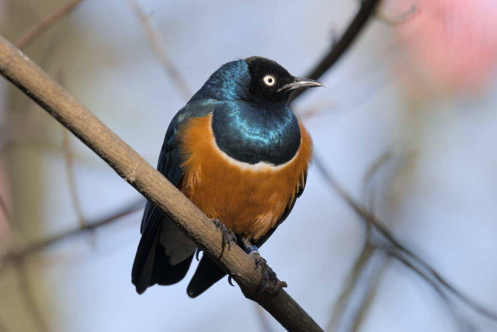 アフリカに多くの種が生息する光沢色をもつムクドリのうちの一種。本種は北東アフリカに分布し、羽は緑で腹部はオレンジ色になり、またその日本名は胸の青い部分と腹部との間に白い弧が見られることから名付けられました。