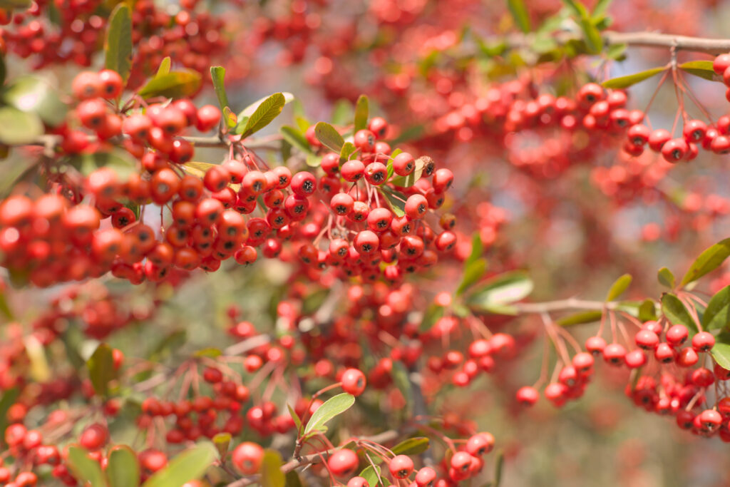 西アジアから南ヨーロッパを原産とする常緑低木。日本では帰化種として定着しており、11月〜12月頃に赤く鮮やかな多数の果実を実らせ、その後2月〜3月頃までかけて熟していきます。