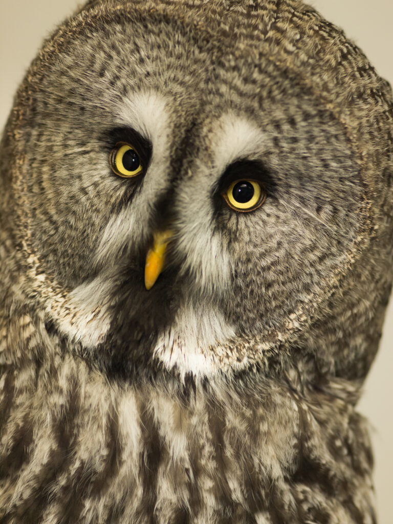 北半球のスカンジナビアからシベリア、カナダ、また一部アメリカ北部も含む寒冷な針葉樹林帯に分布。胴体は小さいものの分厚く長い灰色の羽毛に覆われ、この羽を含めると世界最長のフクロウであり、樹木に擬態しつつ体温を保持しています。また非常に聴力に優れ、その大きく丸い顔をパラボラ集音器の役割に用いて音を耳に集めることで雪の下にいるげっ歯類の位置を正確に把握、空中から雪上へ舞い降りて獲物を掴み取ります。